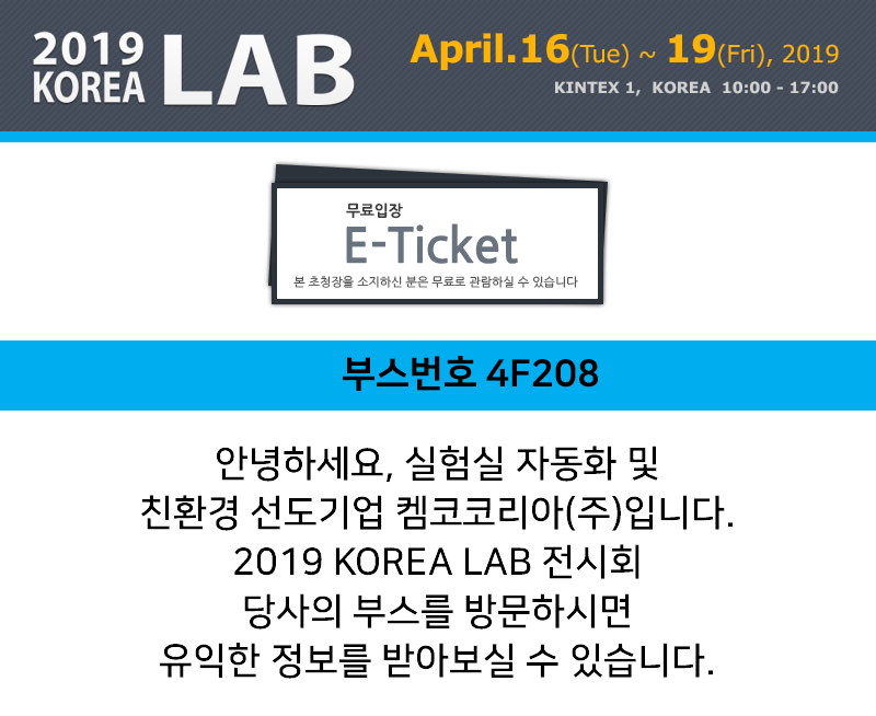 켐코코리아에서 2019년 4월 16일부터 19일까지 일산 KINTEX에서 열리는 KOREA LAB 전시회에 참가합니다.