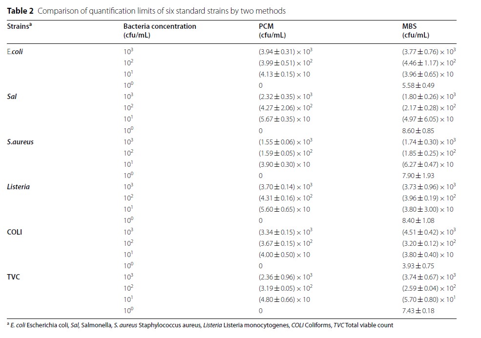 Table2.는 MBS 방법과 기존 PCM 방법의 표준 균주의 정량 한계 비교 표입니다.