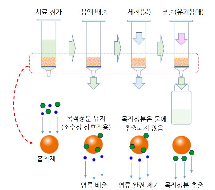 이때 극성이 낮은 목적성분은 흡착제에 흡착되고, 극성이 높은 염류는 배출되고, 물로 세척을 하여 완전히 제거합니다.\