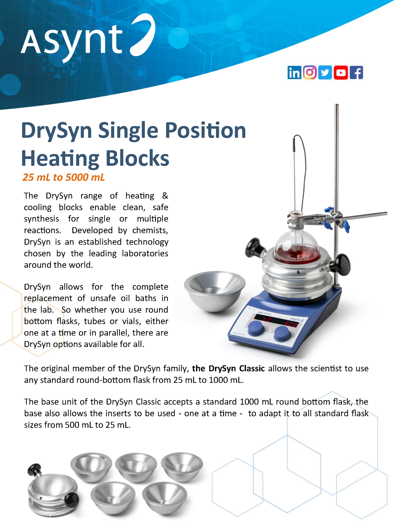 • The DrySyn Scholar kit comprises a base designed for a single 250 mL round bottom flask, and one insert designed for a single 100 mL round bottom flask.