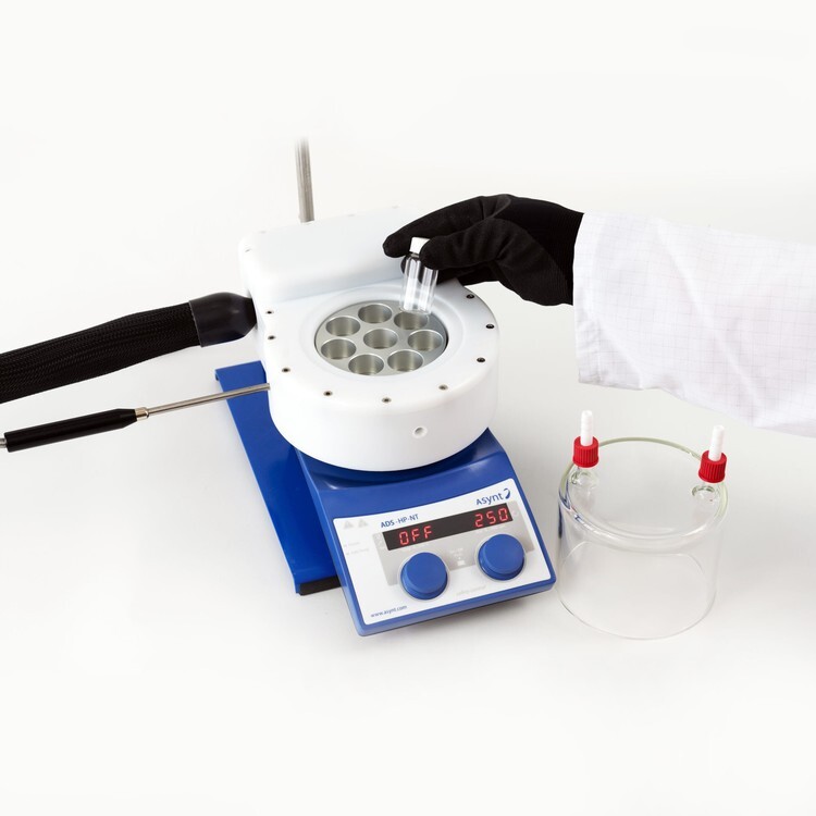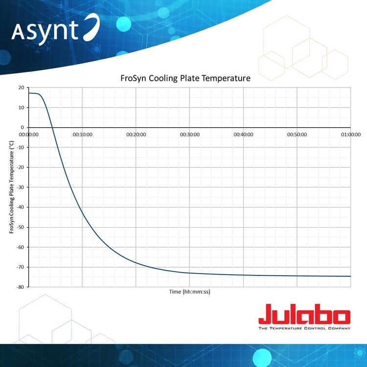 Active temperature control, via. a Pt100 sensor positioned in the insulated base plate, allows the user to set a defined plate temperature (down to -70 °C) and prevents temperature fluctuations over time – resulting in excellent reproducibility and improved reaction control. Unlike dry ice cooling baths that require constant attention, the stable and controlled sub-ambient performance of the FroSyn means that even overnight reactions can be performed with complete confidence.