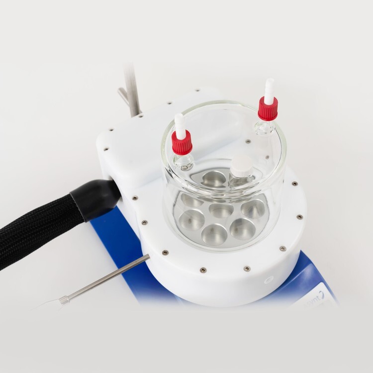The FroSyn can be used with either a set of standard insets for round bottom flasks from 50 mL to 500 mL, or with custom manufactured reaction vial holding plates. The use of either weights and seals for the flask inserts or an inerting dome with the vial plates prevents the formation of ice on the glassware. Other custom cooling accessories are also available to compliment different applications, for example a 4-position holding module for battery research and development.