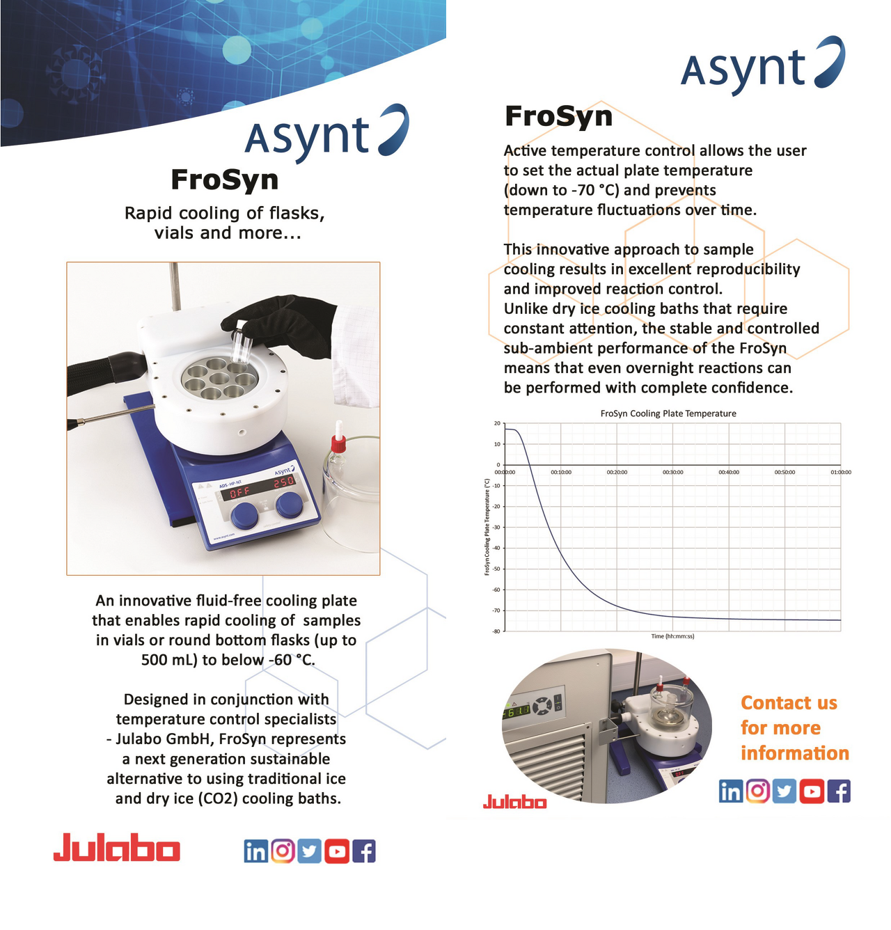 Designed in conjunction with temperature control specialists, Julabo GmbH, as a sustainable alternative to traditional ice and dry-ice baths within the laboratory; FroSyn enables rapid cooling of samples, is simple to use and is compatible with a wide range of glassware.