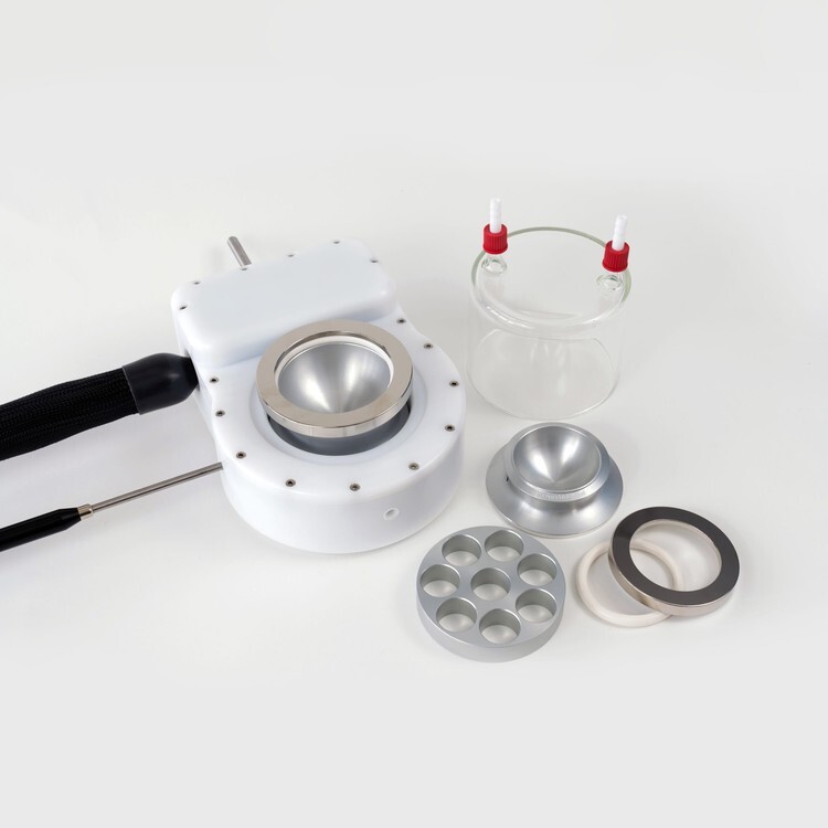 The FroSyn can be used with either a set of standard insets for round bottom flasks from 50 mL to 500 mL, or with custom manufactured reaction vial holding plates. The use of either weights and seals for the flask inserts or an inerting dome with the vial plates prevents the formation of ice on the glassware. Other custom cooling accessories are also available to compliment different applications, for example a 4-position holding module for battery research and development.
