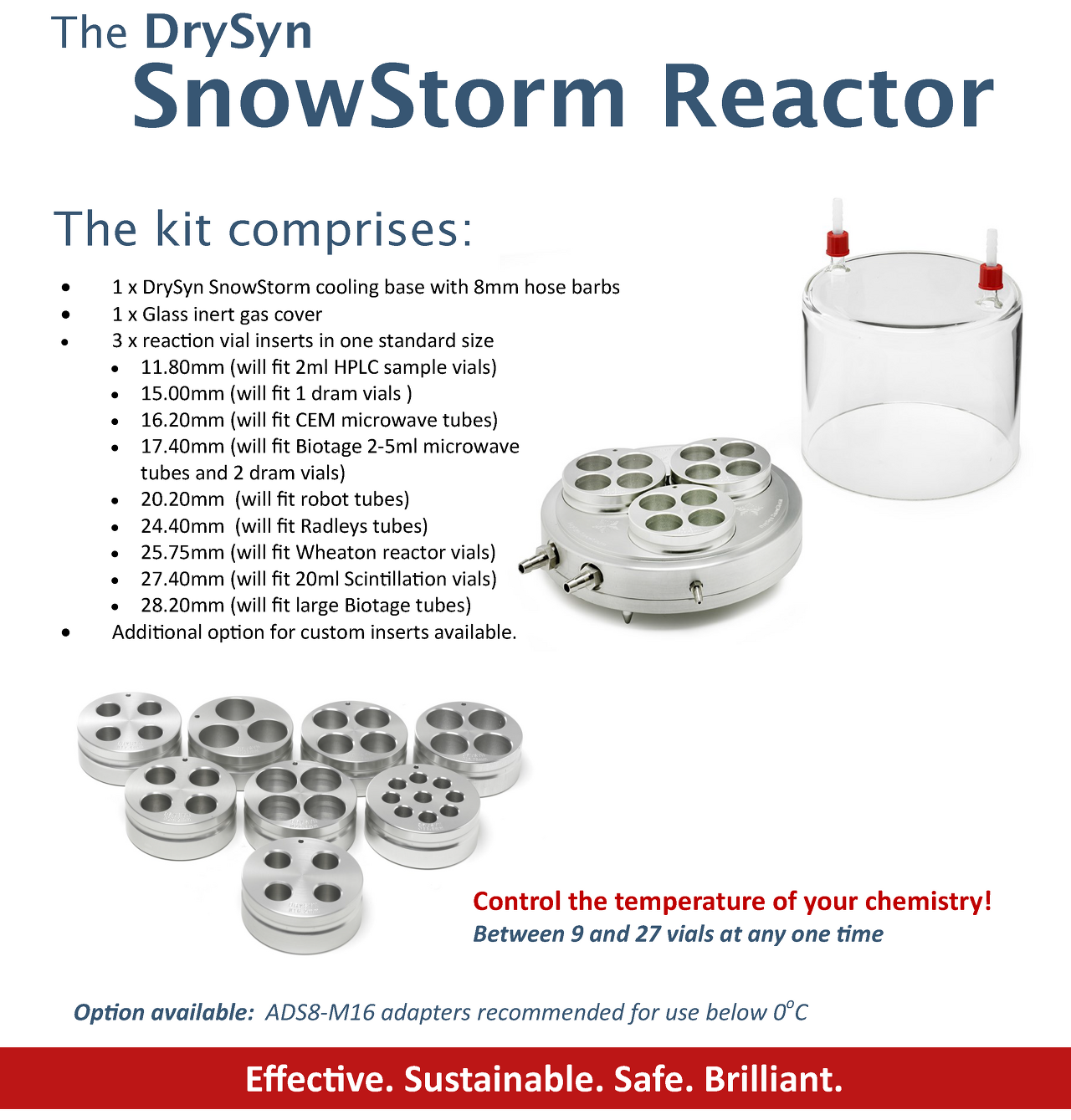 - Kit supplied: Cooling base, glass dome, one pack of 3 standard reaction vial inserts as detailed below.