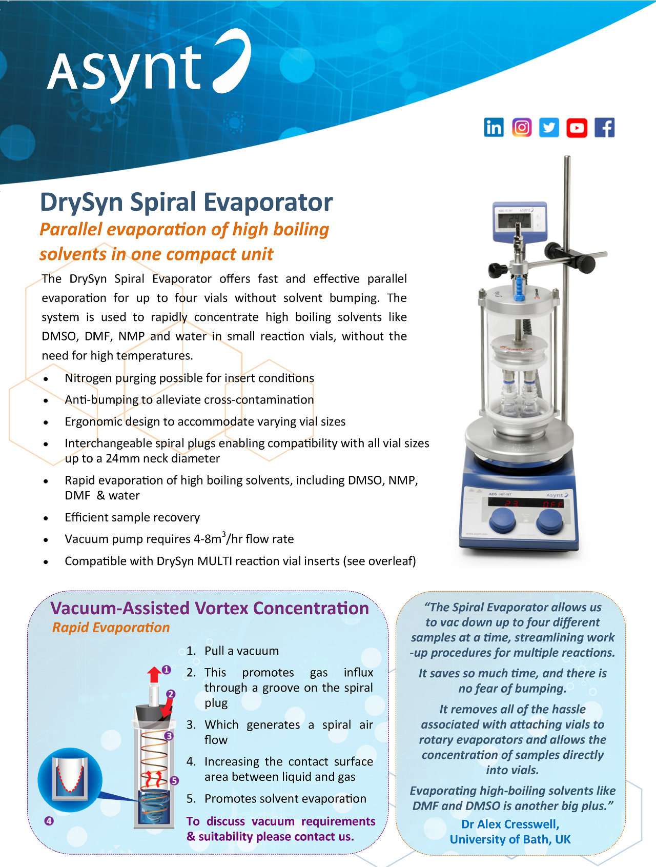 Asynt, in conjunction with BioChromato (Japan), have developed the NEW DrySyn Spiral Evaporator which enables scientists to evaporate tubes directly in DrySyn reaction vial blocks up to 4 samples at a time.