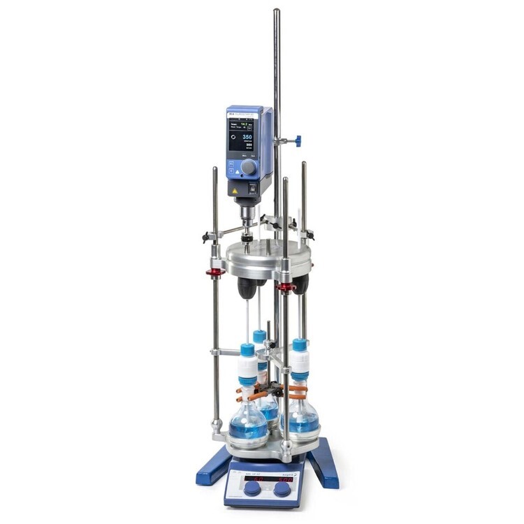 - Operates with only one overhead stirrer for up to three 500 mL round bottom flasks