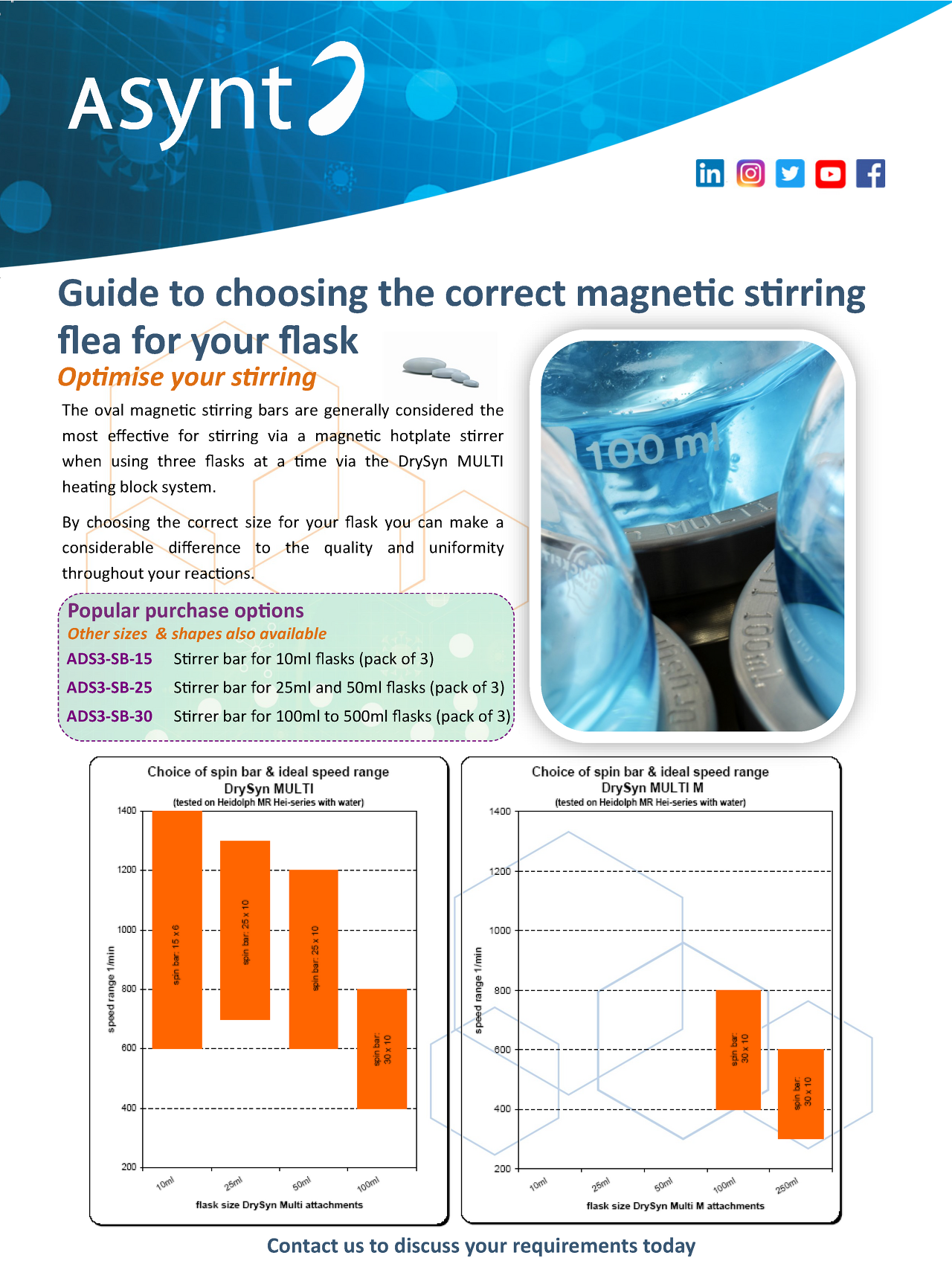 With so many options available, we’ve detailed our most commonly selected magnetic stirrer bars and spin vanes below for you. If you can’t see what you need here though, please contact us and we’ll specify the perfect one for your chemistry.