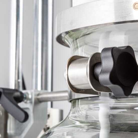 The stainless steel and aluminium framework comes complete with a neck clamp to secure your vessel in place, as well as a bottom support ring to stabilise larger vessels. The unique overhead stirrer support mechanism allows for simple alignment and the secure lifting mechanism allows for the use of all reaction vessels up to 30,000 mL.