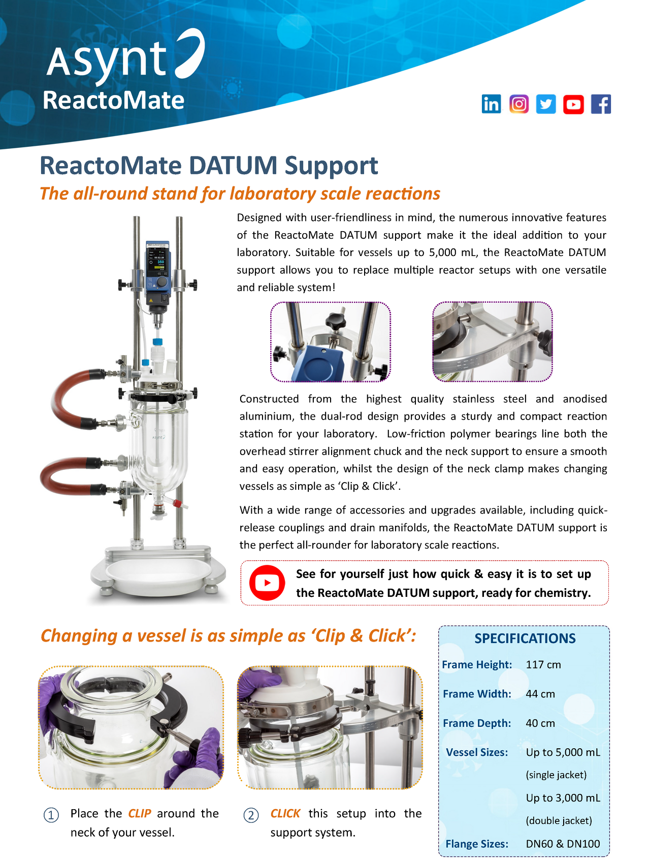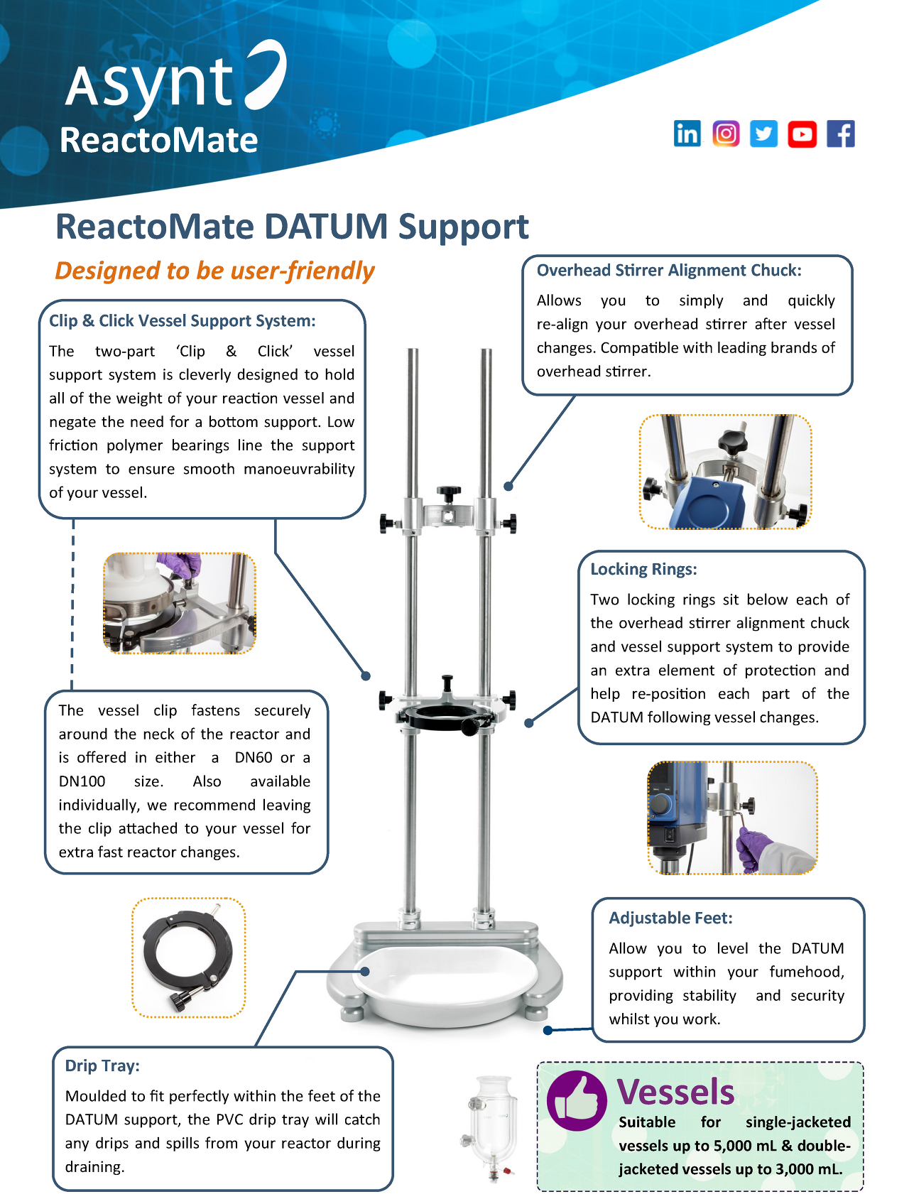 With a wide range of accessories and upgrades available, including quick-release couplings and drain manifolds, the ReactoMate DATUM and DATUM Dual supports offer the flexibility and reliability to take their place as the perfect all-rounder in your laboratory.