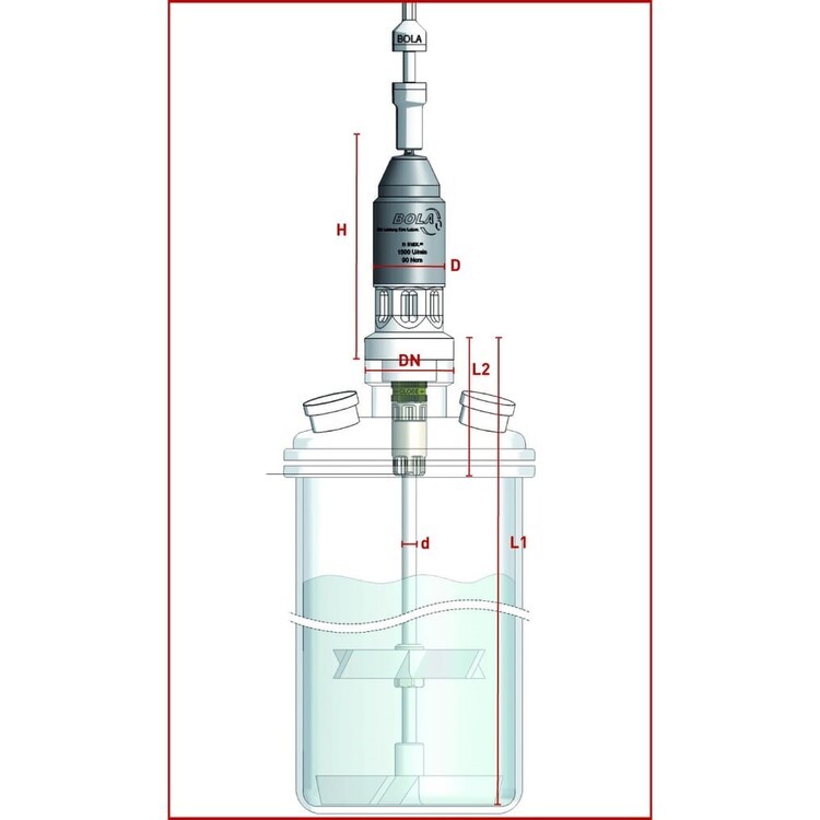 Consisting of capsuled drive shaft (stainless steel) with ball bearings, rotor and lower bearing made of PTFE/PEEK and a hollow shaft made of borosilicate glass.