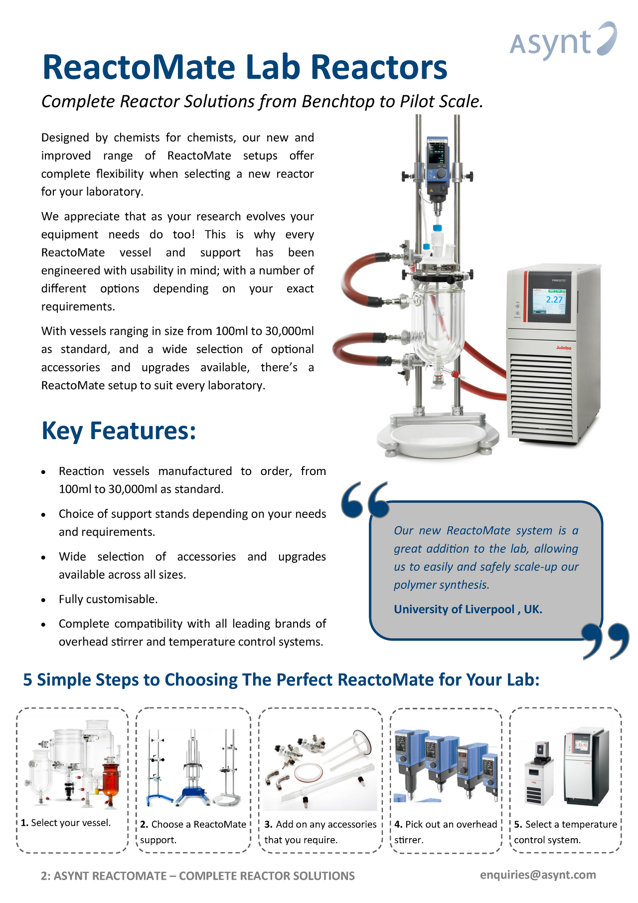 We can work with you to supply new ReactoMate reaction vessels from 50 mL benchtop scale to 50 L + pilot scale single jacketed reaction vessels. You may choose from clear borosilicate vessels or with an amber coating for reduced effect of sunlight on your work for example.
