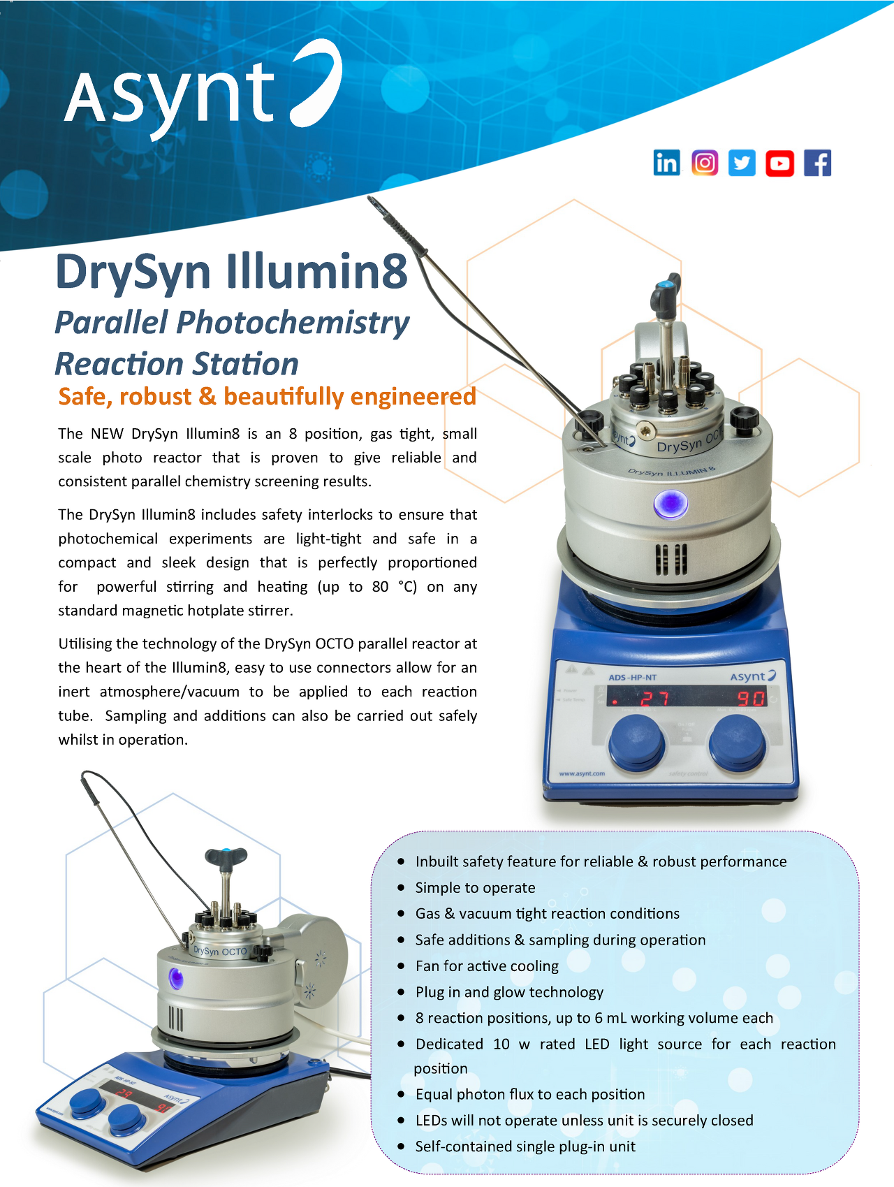 Illumin8 parallel photoreactor is ideal for safe, benchtop parallel photochemistry. Working closely with some of our key customers we took their “go to” tool for parallel screening, our OCTO parallel reactor, and developed a high powered LED photo array to compliment it. Illumin8 is a no-compromise, safe, well-engineered module based on the DrySyn OCTO MINI 8-position reaction station with magnetic stirring and optional heating via any standard hotplate stirrer..