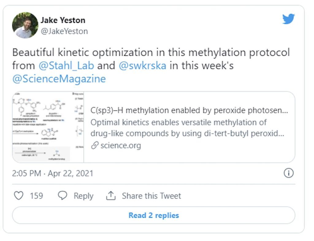 As a few added rules, this year, we eliminated from contention any paper using the terms variant, strain, antibody, viral, or anti-viral. So, we apologize. Even if your paper “A new photocatalytic variant of the Minisci reaction for labeling coronavirus antibodies” is the greatest piece of literature ever prepared, we won’t be reading it or highlighting it to avoid triggering our audience in this hellscape that we live. To answer a comment from our list from last year, our focus is definitely biased towards synthetic photoredox. So, all the great papers out there in more traditional photochemistry, solar cell, energy research and materials are generally not on our radar and likely not included on this list. If you have made that list, send it our way, we would love to read it. So, let’s have some fun. Keeping reading for our favorite papers from 2021 and then send us your favorites on twitter (@EvoluChem) or at info@hepatochem.