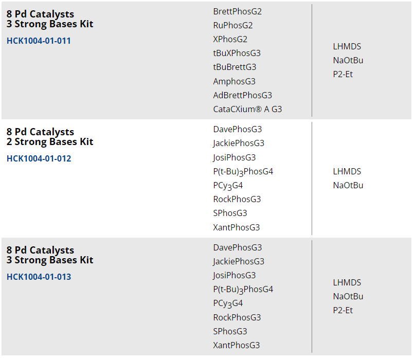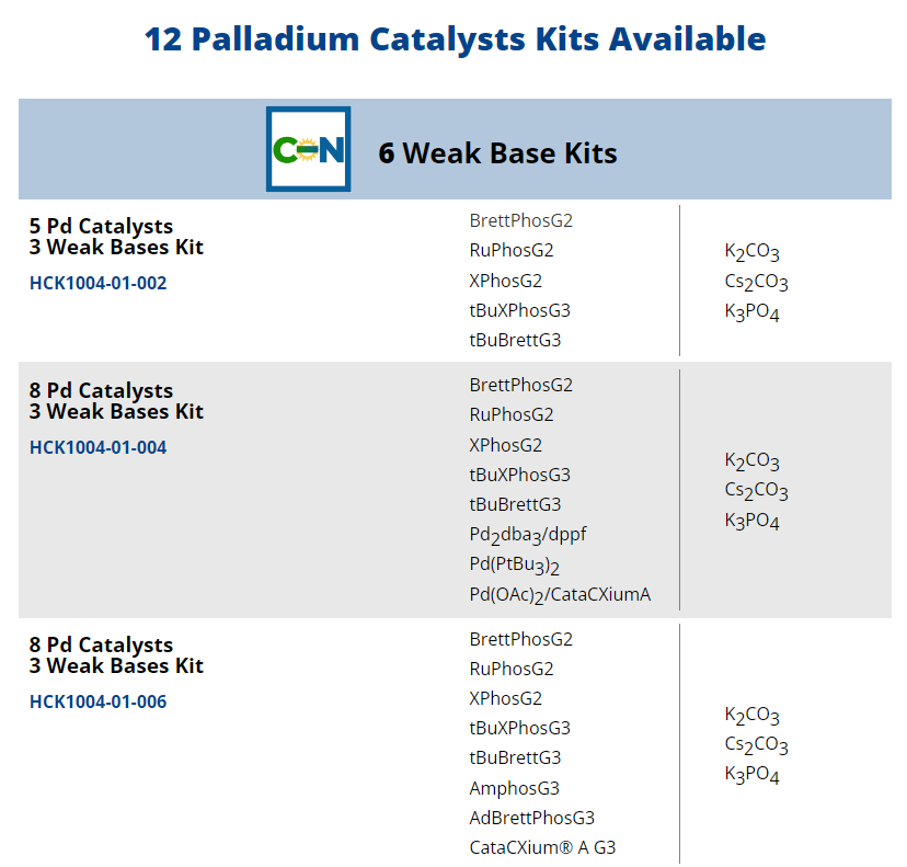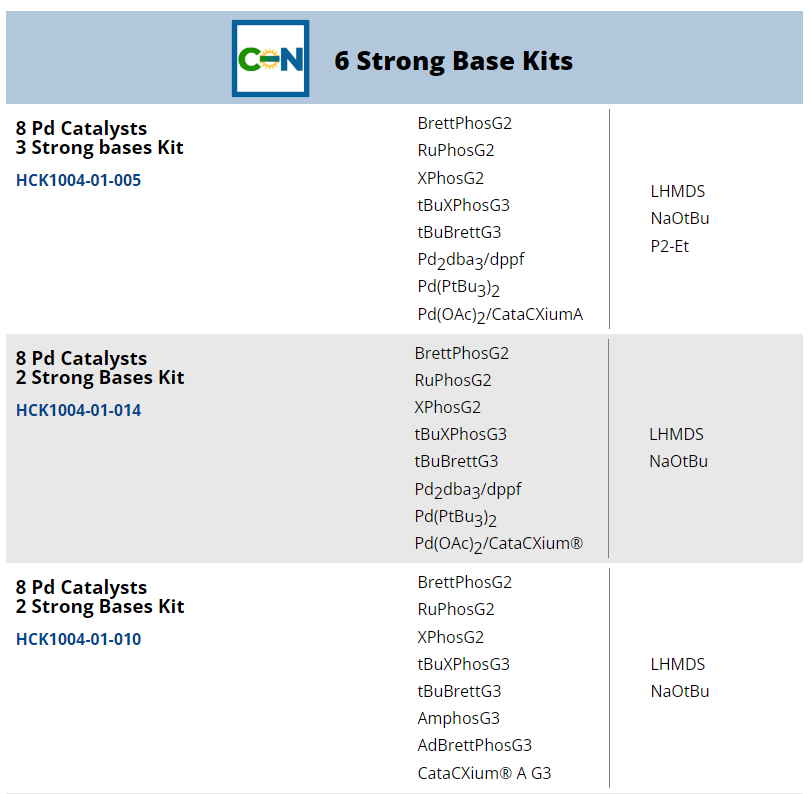 Palladium catalyzed amination (Buchwald-Hartwig amination) can be performed using a wide variety of palladium sources, ligands, bases and solvents. We designed 2 kits using a combination of palladium precatalysts with either strong bases or weak bases.
