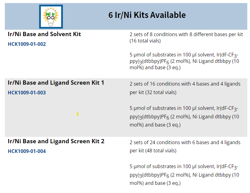 Photoredox chemistry has been reported in the literature using a wide range of catalysts and reagents. However, often these reactions are highly substrate, solvent and base specific. In order to facilitate the screening of common photochemistry reactions, HepatoChem has released a series of high-throughput photocatalysis reaction screening kits combining common Iridium, Nickel, ligand and base combinations to achieve successful cross-coupling transformations.