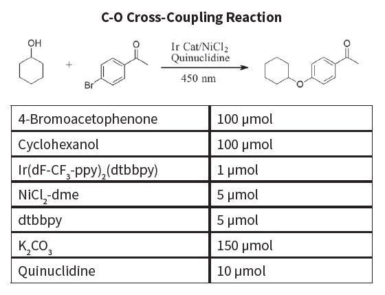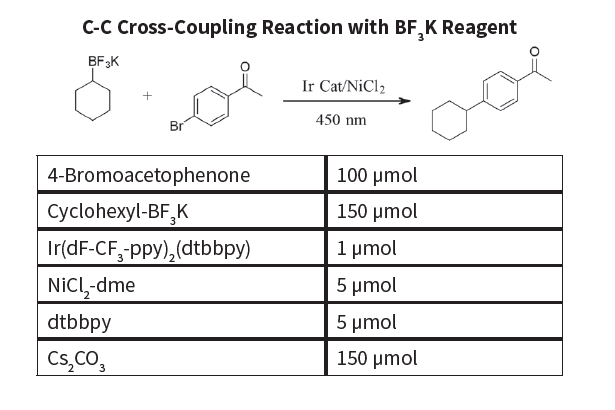 Using Bromoacetophenone as a test substrate, we have organized four reaction conditions to explore photocatalysis. These reactions are well documented in the scientific literature and have been consistently reproduced with the Starter Bundle equipment. The reactions represent foundational cross-coupling photochemistry including two C-C cross-coupling reactions (one with amino acid decarboxylation and one with BF3K reagent), C-N cross-coupling and C-O cross-coupling.Each of the following reaction kits contains four (4) vials with reagents and catalysts and one (1) vial with the test compounds (4-Bromoacetophenone). Once you have successfully performed the test reaction you will be able to use the remaining three