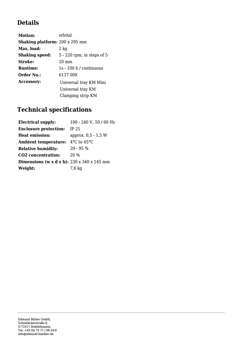 | Shaking speed: | 5 - 220 rpm, in steps of 5 |