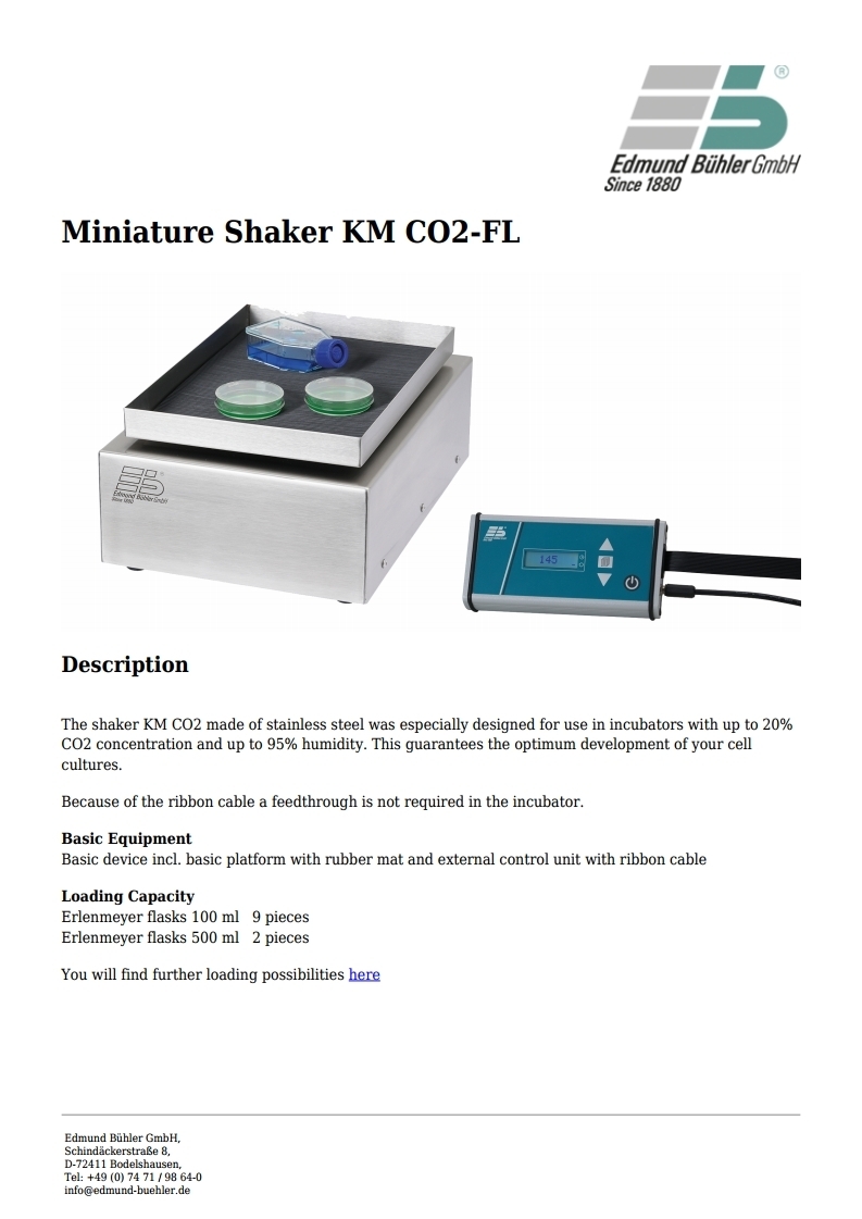 The shaker KM CO2 made of stainless steel was especially designed for use in incubators with up to 20% CO2 concentration and up to 95% humidity. This guarantees the optimum development of your cell cultures.
