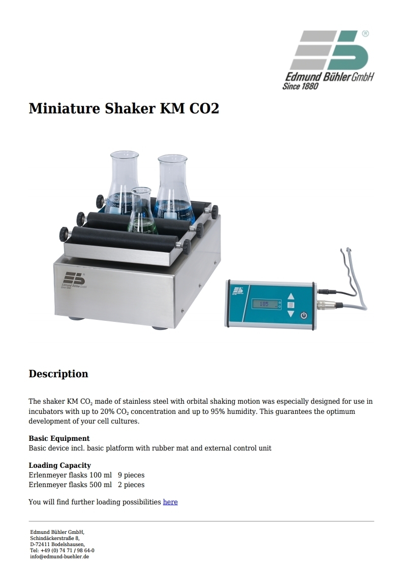 The shaker KM CO2 made of stainless steel with orbital shaking motion was especially designed for use in incubators with up to 20% CO2 concentration and up to 95% humidity. This guarantees the optimum development of your cell cultures.