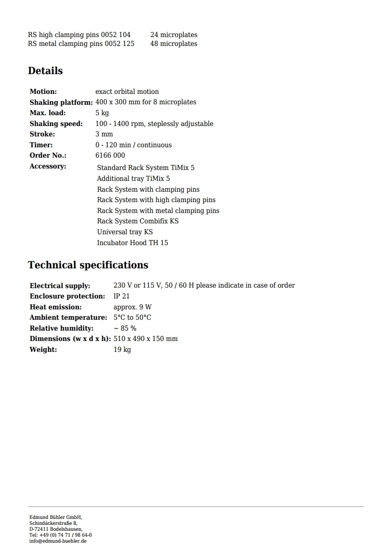 | Accessory: | Standard Rack System TiMix 5 Additional tray TiMix 5 Rack System with clamping pins Rack System with high clamping pins Rack System with metal clamping pins Rack System Combifix KS Universal tray KS Incubator Hood TH 15 |