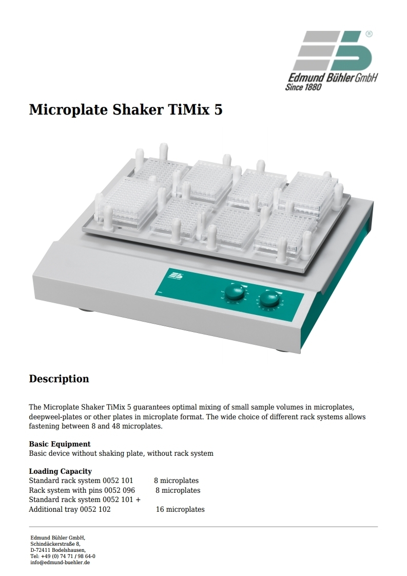 The Microplate Shaker TiMix 5 guarantees optimal mixing of small sample volumes in microplates, deepweel-plates or other plates in microplate format. The wide choice of different rack systems allows fastening between 8 and 48 microplates.