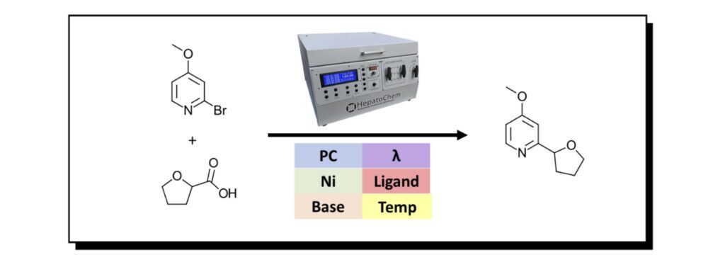 Each reaction was performed with 1 equiv. of 2-bromo-4-methoxypyridine (0.084 mmol) and 1.5 equiv. of tetrahydrofuran-2-carboxylic acid (0.127 mmol) with 1 mol % photocatalyst, 10 mol % Ni source and 15 mol % ligand with 1.5 equiv. base. Total volume of each reaction was 1 ml in DMA. Each reaction was performed in a 2 ml vial crimp vial with a Teflon septa cap. Reactions were prepared and capped in a N2 filled glove box using previously sparged DMA solvent. Reactions were performed in Lucent360 with 24x2ml sample holder at 30 °C for 2 hours. At completion of reaction, samples were diluted with internal standard in a suitable solvent for analysis by LC-MS. Based on the reaction parameter screen desired, photocatalysts, Ni source, ligand, base, light source, light intensity, and temperature were varied.