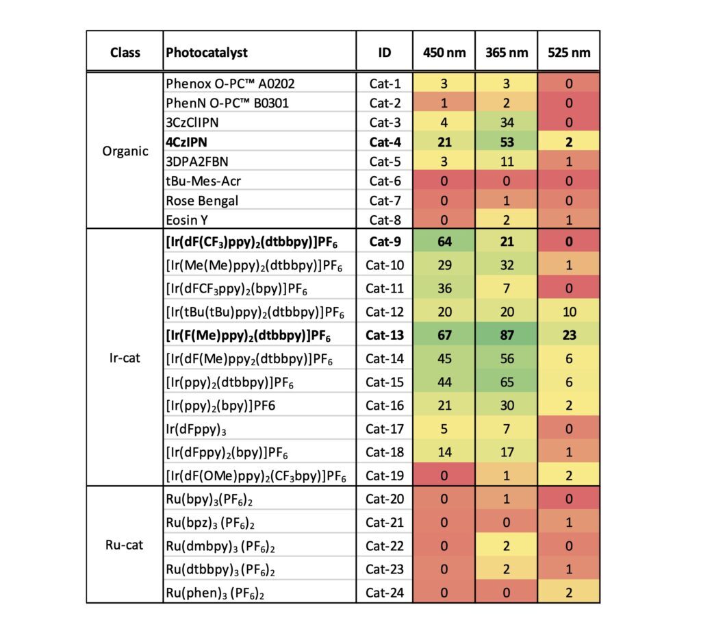 To start, we chose a set of 24 commercially available iridium, ruthenium and organic photocatalysts (see Figure 3). Each catalyst was prepared as a solution in DMA and added to vials containing the substrates, followed by a premixed NiCl2-glyme/dttbpy solution in DMA. The DBU was added, and vials were placed in the Lucent360™ with 4 x 450 nm side light LEDs modules set at 50% of intensity and temperature set at 30 °C for hours. After that, we swapped in 4 x 365 nm light modules and reran the same screen. Followed by 4 x 525 nm lights Why? Because we can and it’s simple to do.