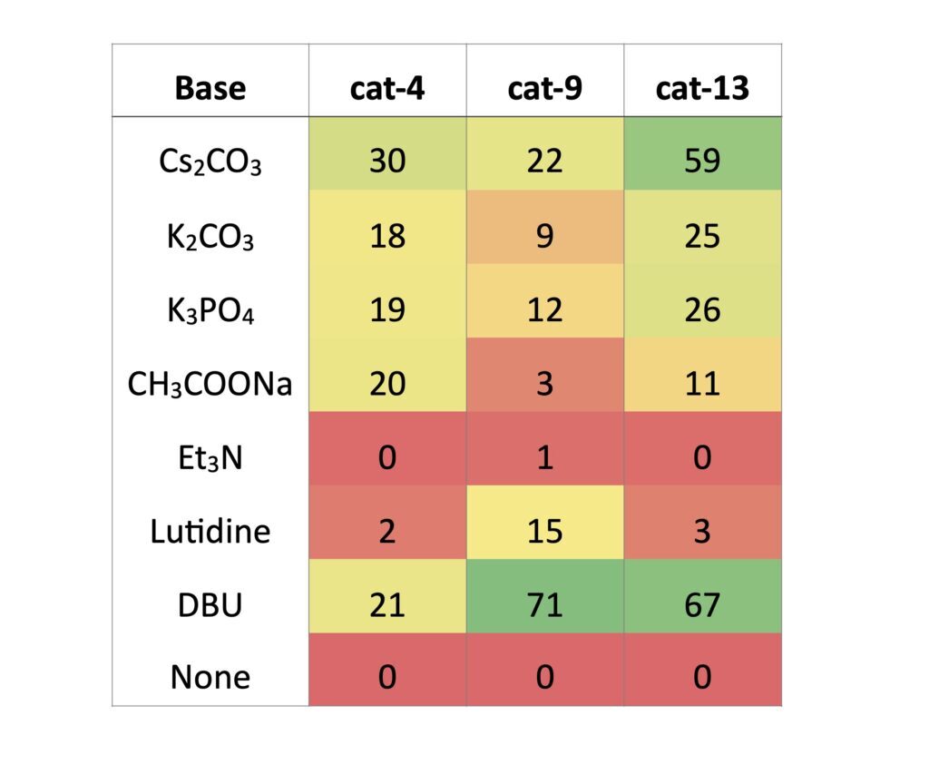 Finally, we chose 7 bases and 1 control to screen for each of our 3 catalysts. Here the nature of the bases requires many to be individually weighed into the vials. As such even though both Cs2CO3 and DBU were successful, the ease in handling and potential for adaptation to flow suggests DBU is still preferable.