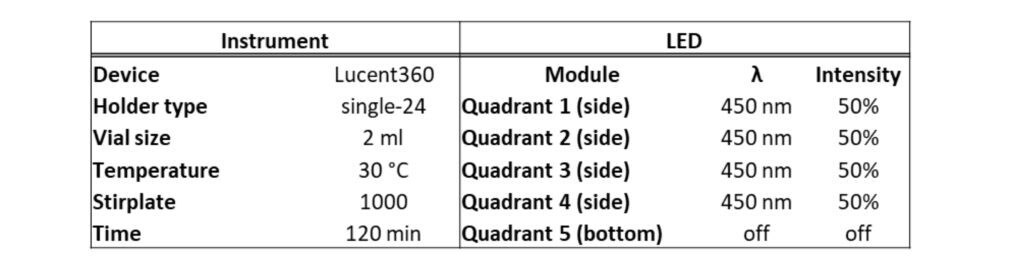 For the photoreactor, if you haven’t guessed, we are using the Lucent360™. This allows us to pick and choose different wavelengths, light intensity, and temperatures. Ultimately, we would like to find a reaction condition to make grams of this important compound or more accurately, find a reaction that we can use to write about the scale up capabilities of the Lucent360™ in batch and flow. Here we’ll use 365, 450 and 525 nm LEDs, however many wavelength options exist from 254 nm to 740 nm. We’ll use the 2ml x 24 vial-holder shown below, however vials ranging from 0.3 ml to 20 ml vials or quickly swap in our 700 ml reactor or flow cell with temperature control from 0-80 °C. An example of reactor parameters is shown in Table 2.
