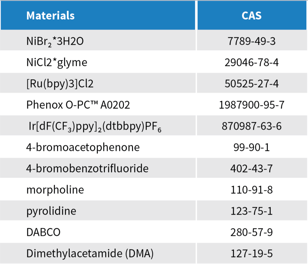 The first reaction is a NiBr₂-catalyzed reaction using 365 nm LEDs that does not require a photocatalyst as reported by Miyake (Ref 1). The proposed mechanism invokes a Ni-amine-solvent complex that is excited by the 365 nm light. This reaction proceeds without the requirement for any additional base if the amine selected is used with 3.5 equiv. of secondary amine.