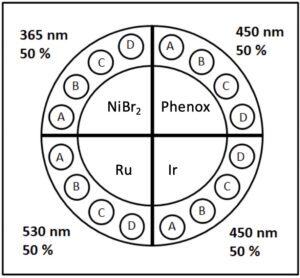 For this example, we will operate the Lucent360™ with four different side modules to screen 365, 450 and 525 nm light. The light intensity for each side module is independently set at 50% and the bottom LED is not in operation for this experiment. Using the multi-light screening holder allows each quadrant to be operated independently without any interaction with the light from the other quadrants. For the 4 ml vial screener, up to 4 reactions can be performed in each quadrant (16 total). This function allows us to design a chemical screen with four unique catalysts each matched to an optimal wavelength for a corresponding C-N bond formation reaction.