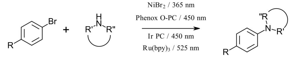 We set out to design a C-N bond formation screen based on known literature examples matched to the ideal LED wavelength excitation for each photocatalyst. The selected transformation occurs between an aryl bromide and secondary amine in the presence of a nickel source, base and a photocatalyst. Each of the four selected conditions uses a nickel catalyst without the need for an additional ligand.