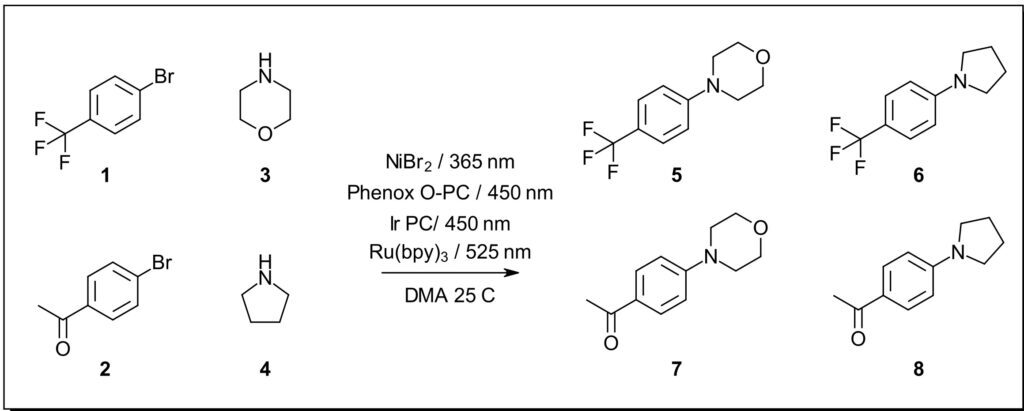 For this screen we selected 2 aryl bromides 4- bromobenzotrifluoride 1 and 4-bromoacetophenone 2 and 2 amines morpholine 3 and pyrrolidine 4 for the potential formation of 4 unique coupling products. The Lucent360™ configuration his affords the opportunity to test each of these potential combinations with each catalyst/wavelength.