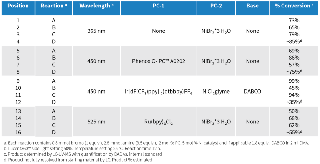 In a single experiment, the Lucent360™ affords the opportunity to screen 16 unique reaction conditions matching the optimal wavelength and catalyst. In this example, we have four combinations of bromo and amine substrates. Setup of the 16 unique reaction conditions using common stock solutions took approximately 1 hour and the reaction time was set for overnight, although it is possible that many of the conditions reach completion in a shorter time.
