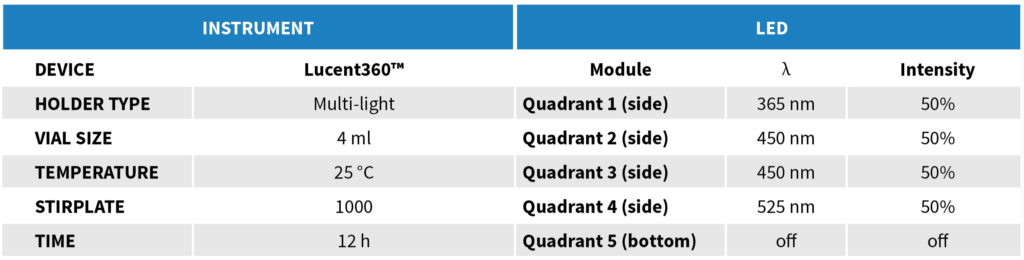 The Lucent360™ temperature control unit maintains a constant and controlled temperature at all positions in the array. For this example, we will run all of the reactions at 25 °C. This prevents temperature increases due to irradiation of the LED’s or from internal exothermic processes. The device can be operated from 0-80 °C with the appropriate coolant.