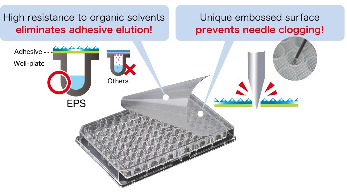 The RAPID EPS (Easy Piercing Seal) punctures easily to prevent needle clogging or damage. In addition, no adhesive residues are left on the plate or injector needle. The RAPID EPS plate seal is made of polyolefin and is highly resistant to organic solvents. Some suggested applications are HPLC and LC/MS.
