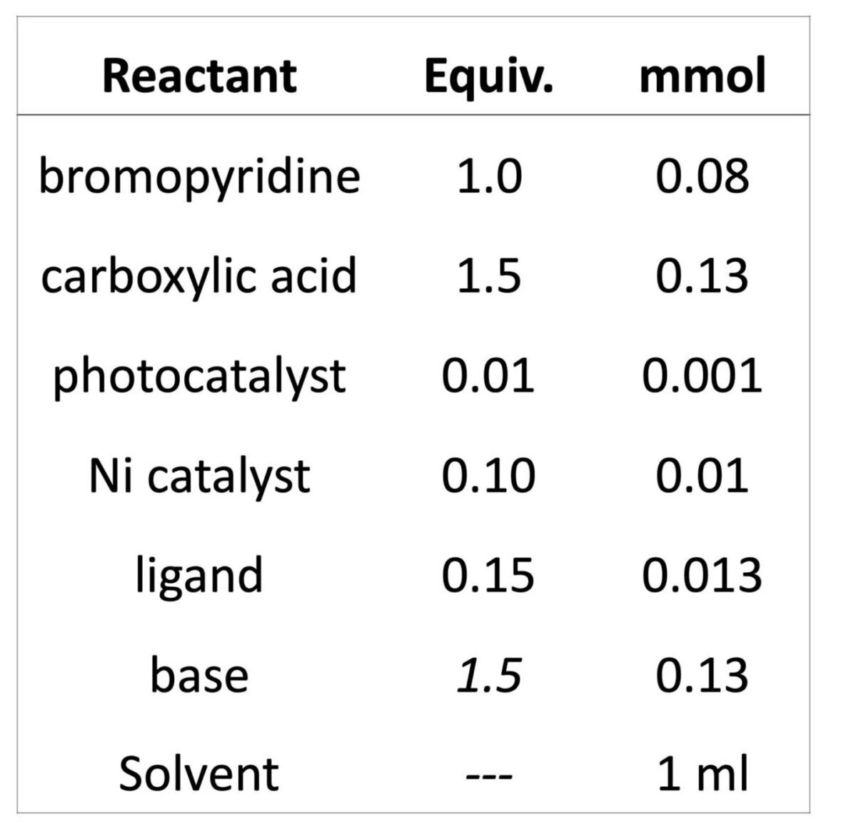 If you’ve read all the links above, then you know you have way too many options for where to start. If you are like us, then you probably made a list of the reagents, checked your shelf, and decided to just GO FOR IT!!! Especially if you have a few interns. To set this up, we know we need a photocatalyst, a nickel co-catalyst and maybe a ligand. A base is required. Our screening will follow the stoichiometry as described in Table 1. We chose to use 2 ml vials, for 1 ml reactions with DMA as a solvent. Why? Because it’s a good solvent and everything we want to test is fully soluble in it. We kept the concentrations and equivalents of each component consistent in each screen. The formal protocol is shown below.