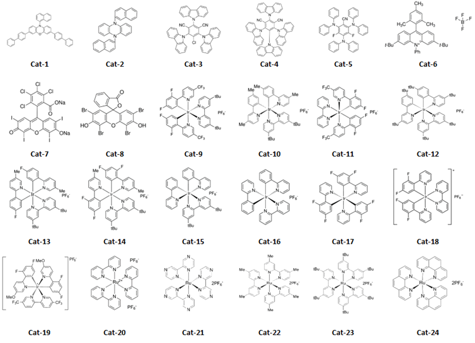 To start, we chose a set of 24 commercially available iridium, ruthenium and organic photocatalysts (see Figure 3). Each catalyst was prepared as a solution in DMA and added to vials containing the substrates, followed by a premixed NiCl2-glyme/dttbpy solution in DMA. The DBU was added, and vials were placed in the Lucent360™ with 4 x 450 nm side light LEDs modules set at 50% of intensity and temperature set at 30 °C for hours. After that, we swapped in 4 x 365 nm light modules and reran the same screen. Followed by 4 x 525 nm lights Why? Because we can and it’s simple to do.