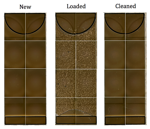 Figure1: The images of the disposable slide when brand new, after loading and after washing has been obtained. Washing can successfully remove all of the cells and debris from the slide.