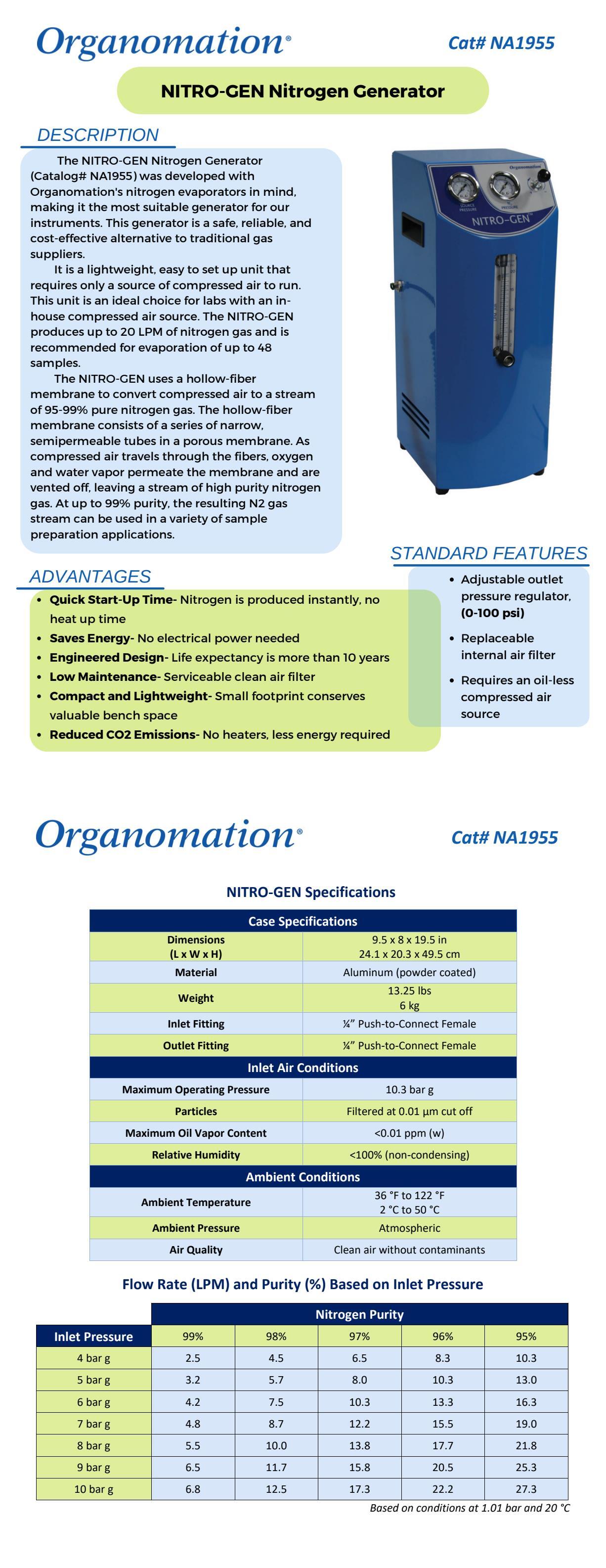 The NITRO-GEN generator was developed with Organomation’s nitrogen evaporators in mind to provide nitrogen generation for sample concentration. The generator is lightweight and easy to set up, requiring only a source of compressed air to run. This unit is an ideal choice for labs with an in-house compressed air source.