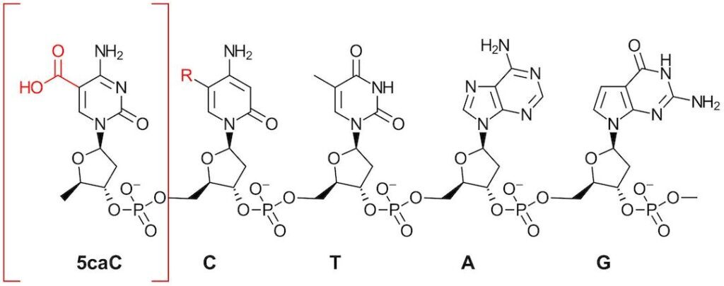 We know that there are 4 nucleobases, adenine (A), cytosine (C), guanine (G) and thymine (T) and that modification of these 4 bases represents the epigenetic code. As the authors state, methylcytosine (5mC) is the most abundant mammalian modification (5% of cytosine sites). Further oxidation of (5mC) results in 5-hydroxymethylcytosine (5hmC), 5-formyl-cytosine (5fC) and 5-carboxycytosine (5caC). We will gloss over the myriad of reasons understanding these modifications are important for either living or dying, but if you want to understand how something works, it’s important to understand what it is to start. And for that you need to be able to differentiate between all these modifications. In this work, the authors focus on 5caC which is poorly understood with relatively low abundance (fewer than 1 base in 106)
