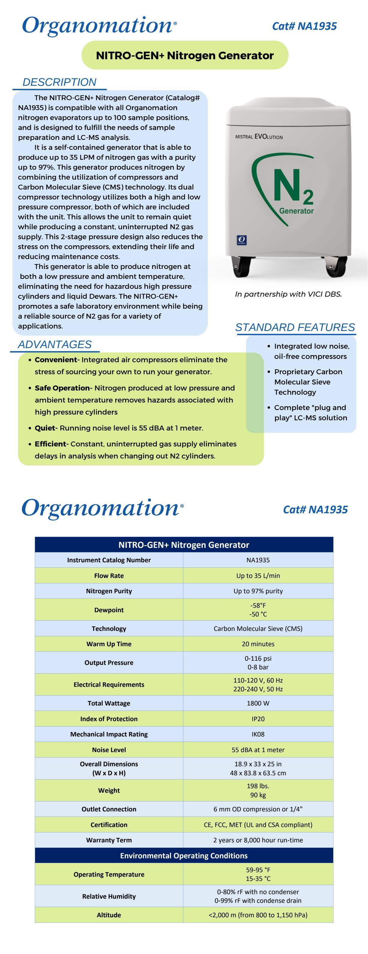 The NITRO-GEN+ Nitrogen Generator is designed to satisfy the needs of the LC-MS and sample preparation fields. The NITRO-GEN+ is compatible with all Organomation nitrogen evaporators up to 100 sample positions, along with most LC-MS analyzers on the market. It relies on Pressure Swing Adsorption (PSA) technology to separate nitrogen from the air. The unit uses molecular sieves to remove oxygen, water, and trace hydrocarbons, leaving a stream of high purity nitrogen gas. Nitrogen is produced by utilizing a combination of this Carbon Molecular Sieve technology along with high and low pressure compressors.