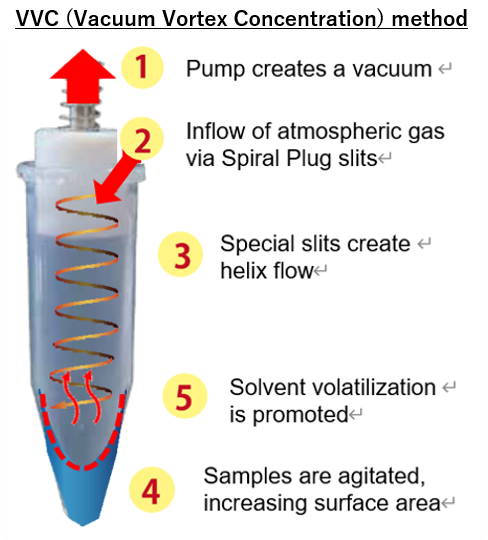 - VVC(Vacuum vortext concentration) method prevents bumping.