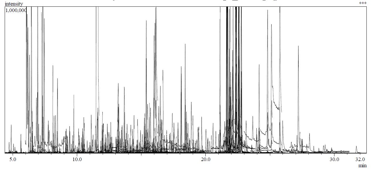커피의 잔류농약 추출은 SamplePrep을 사용하여 미국공인분석학학회 AOAC 2007.01 추출방법을 활용하였다. 정량 방법의 정확성을 위해 매트릭스와 일치된 검량선작성(matrix-matched calibration curve)과 내부표준법을 함께 사용하여 측정하였다. 커피에 Spike 한 표준품 30 ppb대비 회수율 범위(70~120%) 내에서 개발된 SamplePrep 전처리 과정이 적합한지를 판단하였다. 다음 잔류농약 30ppb를 spike한 크로마토그램을 보여준다(Figure 3)(Figure 4).
