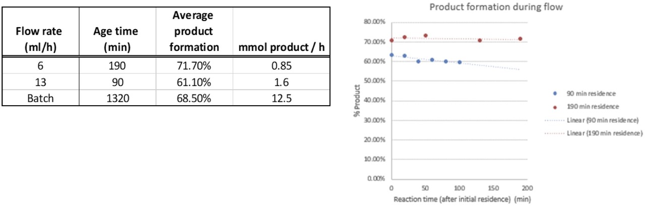 If the reaction works in batch? How does it look in flow? We took the parameters that we established from the batch reactions, along with some previously reported residence times from IRCOF/Oril for this reaction in flow and tested our Lucent360™ 20-ml flow cell.
