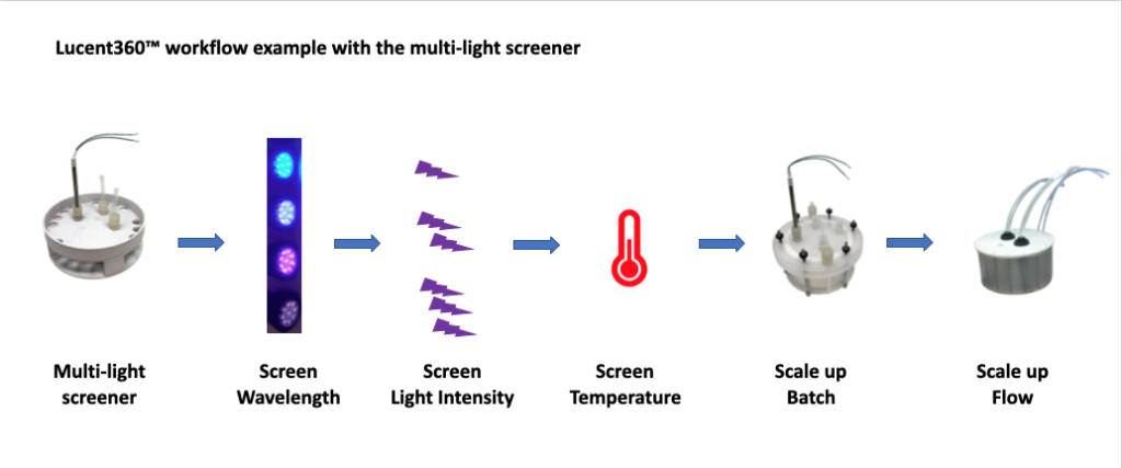 A few weeks ago, we discussed the history of the Lucent360™, our new photoreactor for light and temperatures control for screen to scale, in both batch and flow. This month, we want to share a series of experiments that demonstrate the value of the Lucent360™ for studying a photochemical reaction. This project was brought to us by chemists at the IRCOF and Oril in France*. There is no shortage of possibilities for how to best study a photochemical reaction. Having the tools available to design the best experiment is key. We understand that everyone’s workflow will be different and there is likely no correct order for running a set of reactions. However, here a few steps for taking a new reaction from the screening scale to both batch and flow in the Lucent360™.Figure 1: Example Workflow Using Lucent360™