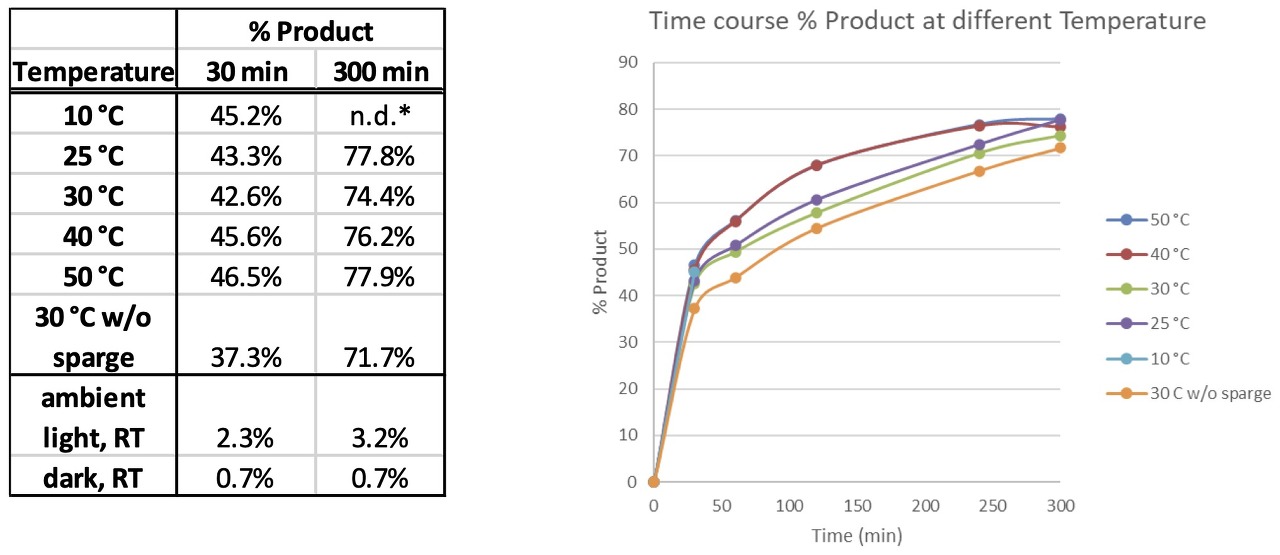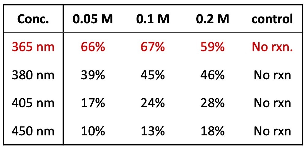 Table 2: Wavelength screen (% product at 180 min) with 100% light intensity