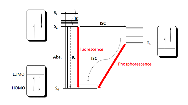 Important to its role as a “catalyst”, alternatively S1 can undergo intersystem crossing (ISC) with spin inversion to generate an excited triplet state T1. This new T1 state should be both lower in energy and exist with a longer lifetime than the S1 state, and thus can exist with sufficient lifetime to undergo bimolecular reactions via energy transfer (EnT) or electron transfer (ET). Unproductively, T1 can relax back to S0 via either internal conversion or by emitting a photon via phosphorescence.