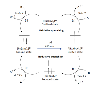 Ru(bpy)3 is the most widely used photocatalyst with well-established photochemical properties suitable for photoredox catalysis (Ref 5). First, with a strong absorbance maximum ~450 nm in the visible region, Ru(bpy)32+ can be excited with fluorescent light bulbs, LEDs, Xe lamps and sunlight (Figure 4a). The resulting *[Ru(bpy)3]2+ triplet state has a significant lifetime (1 µs), long enough to undergo single electron transfer (SET) to organic molecules. The excited state can either proceed through a reductive quenching cycle (Figure 4b, c) or oxidative quenching cycle (Figure 4d, e) acting as both 1 e– oxidant and 1 e– reductant generating open shell reactive species (A·- or D·+).